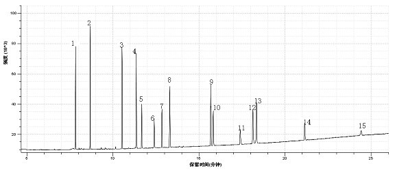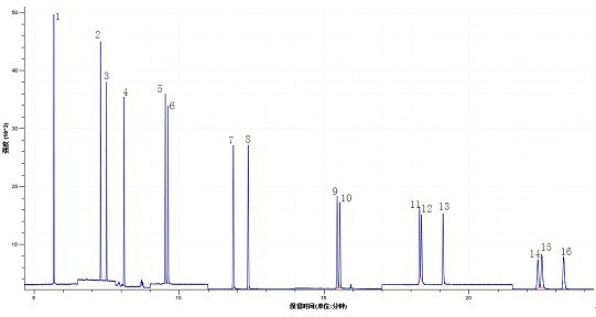 16种PAHs标准规范品SIM扫码化合物流色谱图 1、萘,2、苊烯,3、苊,4、芴,5、菲,6、蒽,7、荧蒽,8、芘,9、苯并[a]蒽,10、屈,11、苯并[b]荧蒽,12、苯并[k]荧蒽,13、苯并[a]芘,14、茚并[1,2,3 cd] 苝,15、二苯并[a,h]蒽,16、苯并[j,h,i] 苝