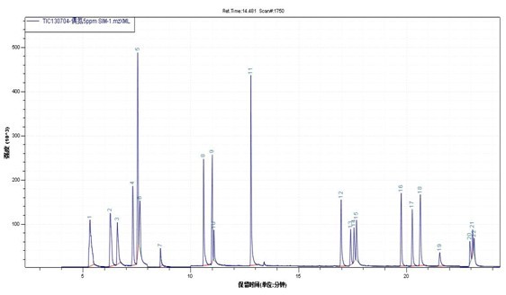 23种馥郁胺全扫视TIC图 1、邻甲苯胺,2、邻氨基苯甲醚,3 、对氯苯胺,4、2-甲氧基-5-甲基苯胺,5、 2,4,5-三级甲等基苯胺和3-氯-2-甲基苯胺,6、4-氯邻甲苯胺,7、2,4-二氨基甲苯,8 、2-萘胺,9、邻氨基联苯,10、5-硝基-邻甲苯胺,11、4-氨基联苯,,12、4-氨基偶氮苯,13、4,4’-二氨基二苯醚,14、联苯胺,15、4,4’-二氨基二苯二氧化氮,16、邻氨基偶氮甲苯,17、3,3’-二甲基-4,4’-二氨基二苯二氧化氮,18、3,3’-二甲基联苯胺,19、4,4’-二氨基二苯硫醚,20、3,3’-二氯联苯胺,21、4,4’-亚甲基-二-(2-氯苯胺),22、3,3’-二甲氧基联苯胺