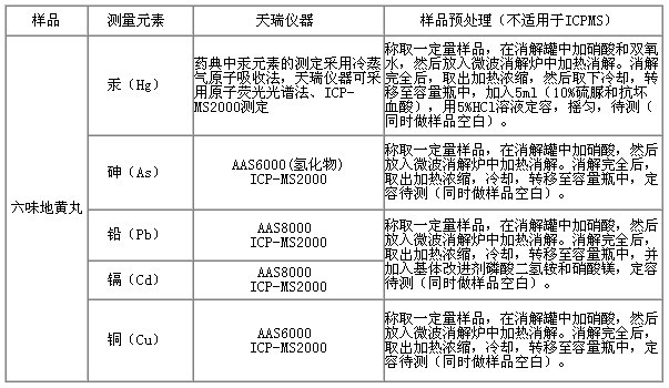 天瑞测验仪器参阅《神州民众中华人民药典》,通过电子层消除光谱分析分析仪(AAS6000;AAS8000)、电子层荧光光谱分析分析仪(AFS200产品系列)、电感解耦等化合物体质谱仪(ICP-MS2000),对六味地黄丸中镉、铅、铜、砷、砷、汞等天价属的检测来实验,测验的结果准确性程度高,多个性好。