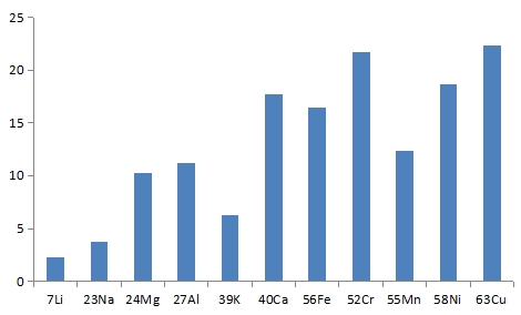 参考《GB/T 32650-2016 电感耦合等离子体质谱法检测石英砂中痕量元素》进行样品前处理。利用冷焰模式及标准模式对样品进行测试,考察背景等效浓度(BEC)、方法检出限(D.L.)、加标回收率、精密度。背景等效浓度在0.6ng/L~60.0ng/L之间,方法检出限在0.3ng/L~88.2ng/L之间,加标回收率在82.1%~120.4%之间,精密度在1.41%~6.92%之间。