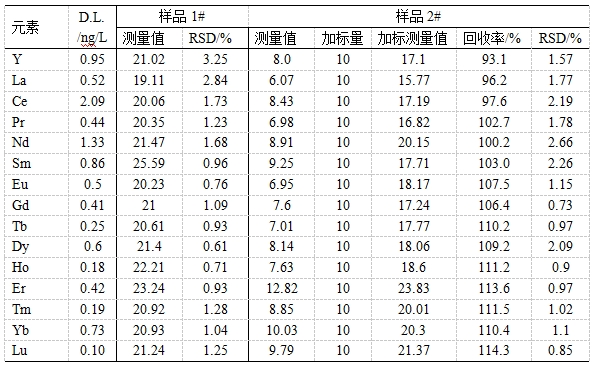 油田稀土示踪剂主要用来考察油田井间的导通性,具有无放射性、安全稳定、用量少、分析精度高等特点。将所得油田水样摇匀过滤,稀硝酸稀释一定倍数,以内标法校正样品基体对待测同位素影响,考察Y、La、Ce等15种稀土示踪剂的检出限、精密度(以RSD表示)、加标回收率。发现检出限为0.10~2.09ng/L;样品1#的精密度为0.61%~3.25%;样品2#中各元素加标回收率为93.1%~114.3%,精密度为0.85%~2.66%。