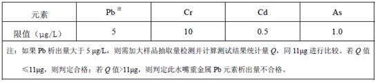 (3)HJ/T 411-2007《坏境标准厂品技术水平规范 水嘴》关键对镉、铅、铬、砷哪几种巨资属设计的析晶量贵局有限皮肤,有限皮肤规范如表3提示: 表3.水嘴与水接触的面积一部分血本属溶解量情人节限定值
