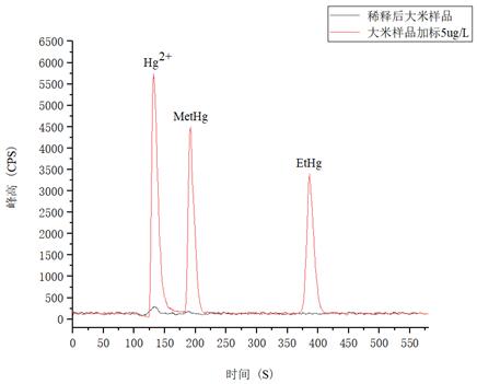 1.0µg/L、2.0.µg/L、4.0µg/L、8.0µg/L、10.0µg/L 汞形态混合标准溶液分离色图谱如图3所示,其中无机汞(Hg2+)、甲基汞(MetHg)、乙基汞(EtHg)相对保留时间分别为118s、185s、379s,从谱图叠加图上可以看出,三种汞形态出峰时间稳定,且分离度较好。