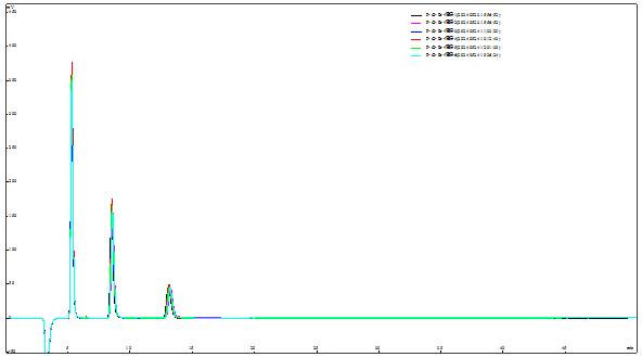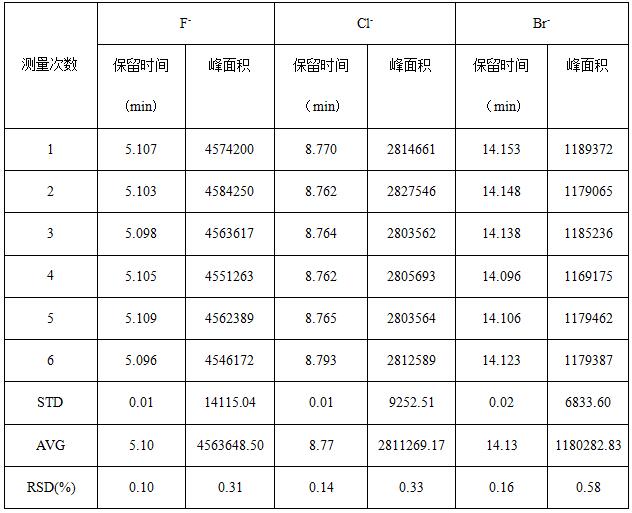 取2.0µg/mL F-、Cl-、Br-混合标准标准溶液重复进样6次,考察保留时间和峰面积的重复性,详见图4;其中保留时间(tR)相对偏差在0.10%-0.16%之间,峰面积(S)的相对标准偏差在0.38%~0.53%之间,重复性结果详见表1。
