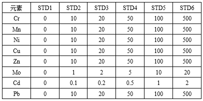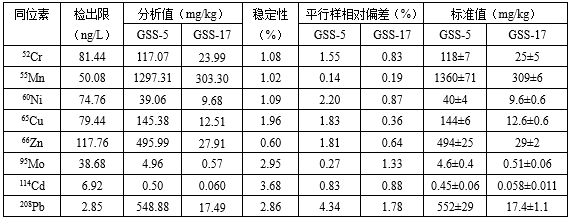 采用ICP-MS2000E电感耦合等离子体质谱仪测定土壤标准物质中Cr、Mn、Ni、Cu、Zn、Mo、Cd、Pb八种金属元素含量,检出限在2.85-117.76 ng/L之间,稳定性在0.60%-3.68%    之间,各元素测试结果与标准值相符,能够满足第三次全国土壤普查中关于电感耦合等离子体质谱法检测上述各元素的要求。
